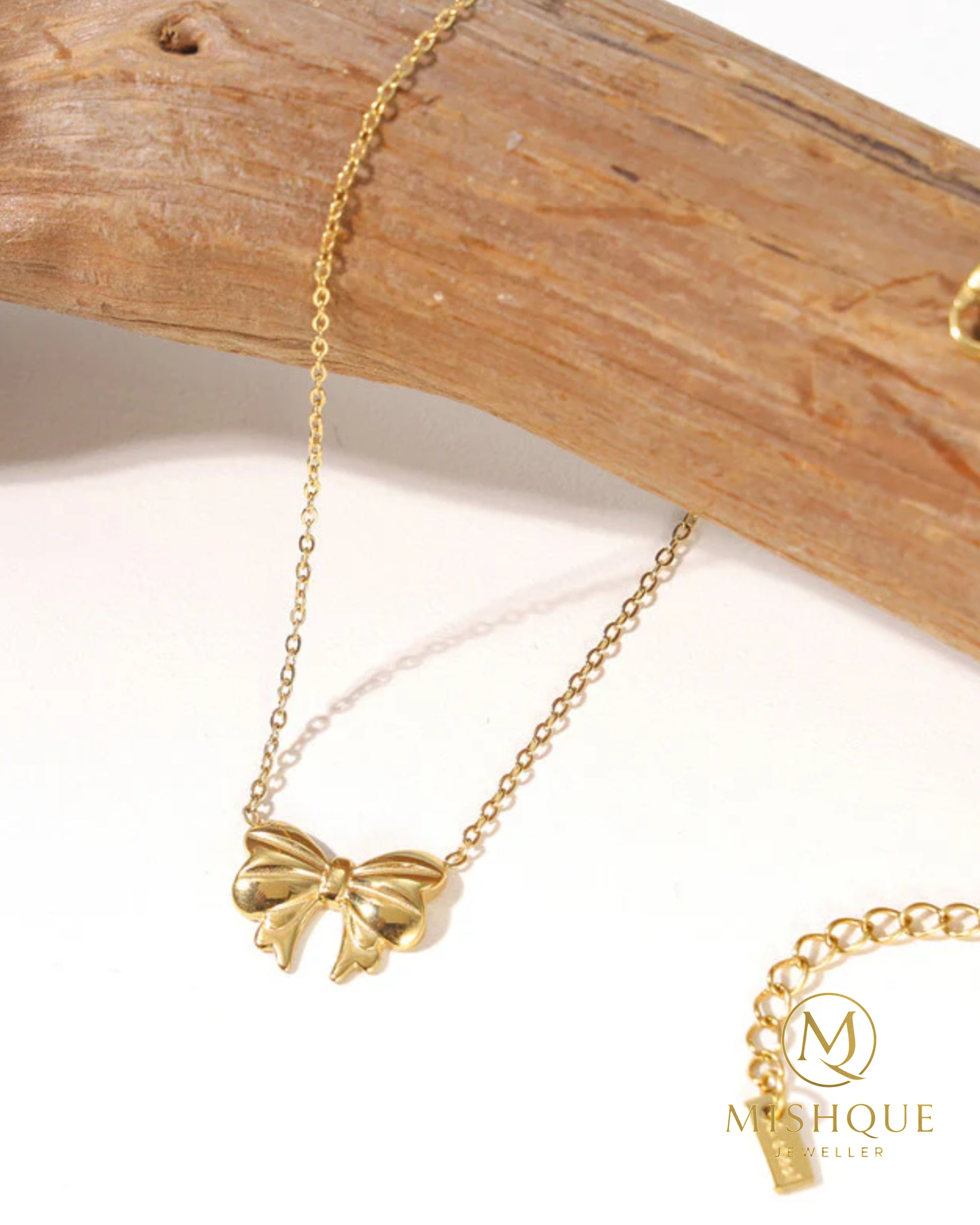 Delicate charm meets timeless elegance with the Belle Noeud Necklace by Mishque Jewellers. Featuring a graceful, sculpted bow pendant suspended from a fine gold-plated chain, this piece evokes femininity and soft sophistication.