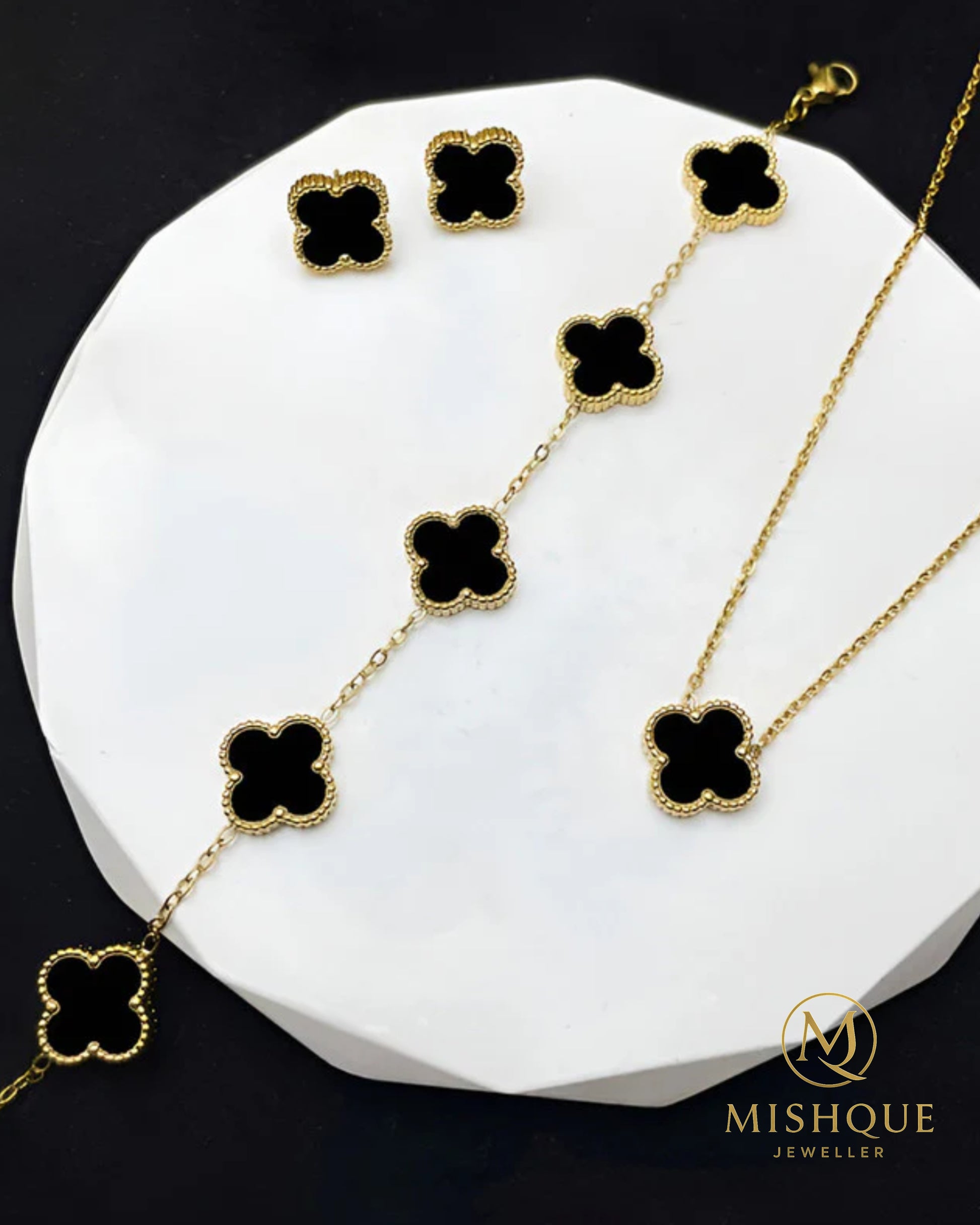 At Mishque Jeweller, elegance meets timeless design with our Clover Jewellery Set — a signature collection that celebrates beauty in contrast. Featuring delicately crafted four-leaf clover motifs in striking black and soft white enamel, each piece reflects sophistication, balance, and harmony.