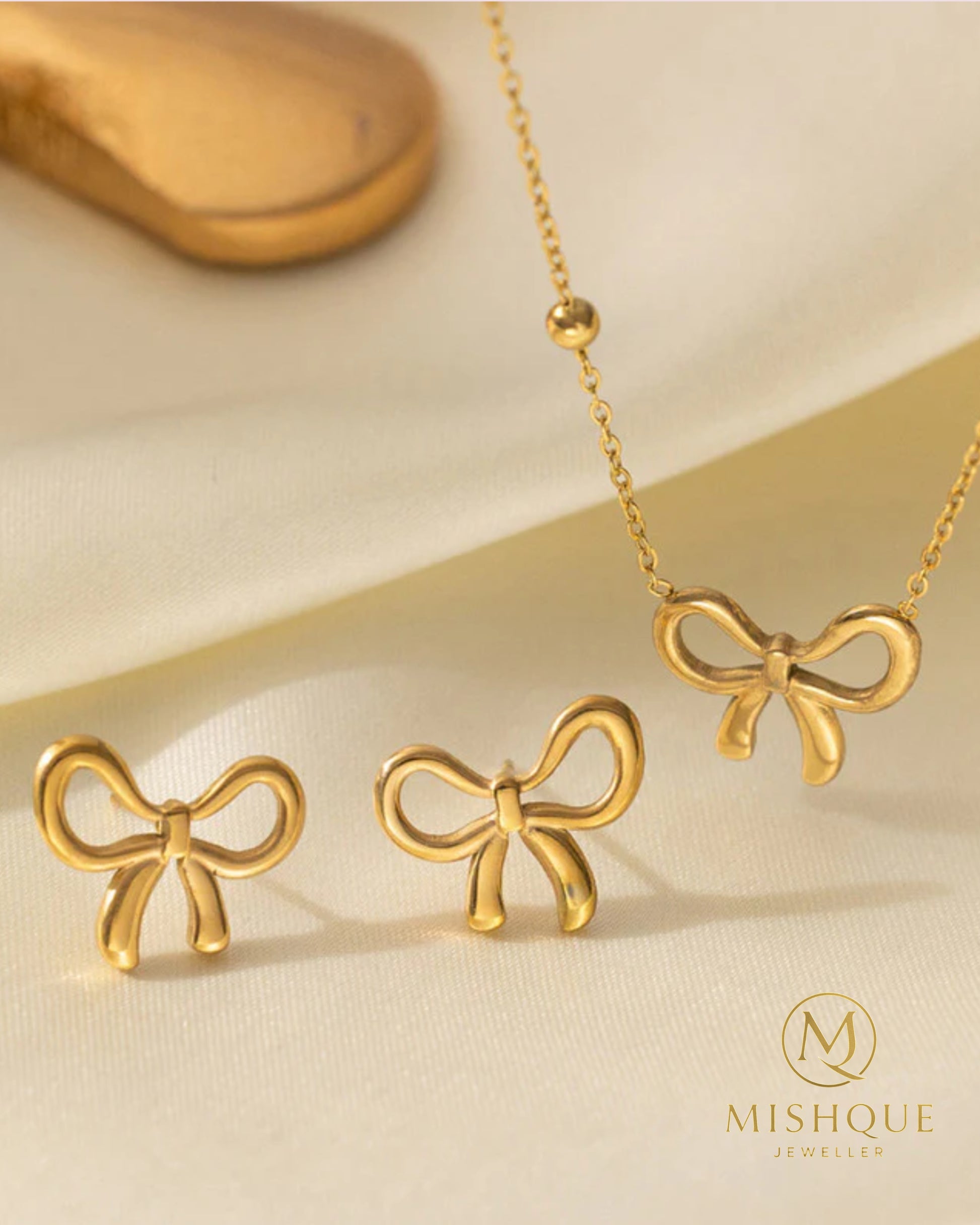 The Golden Grace Bow Set by Mishque Jeweller captures the essence of delicate femininity with its graceful bow motif and minimalistic charm. This elegant set includes a refined bow pendant necklace and matching stud earrings—perfectly suited for everyday elegance or subtle sophistication on special occasions.