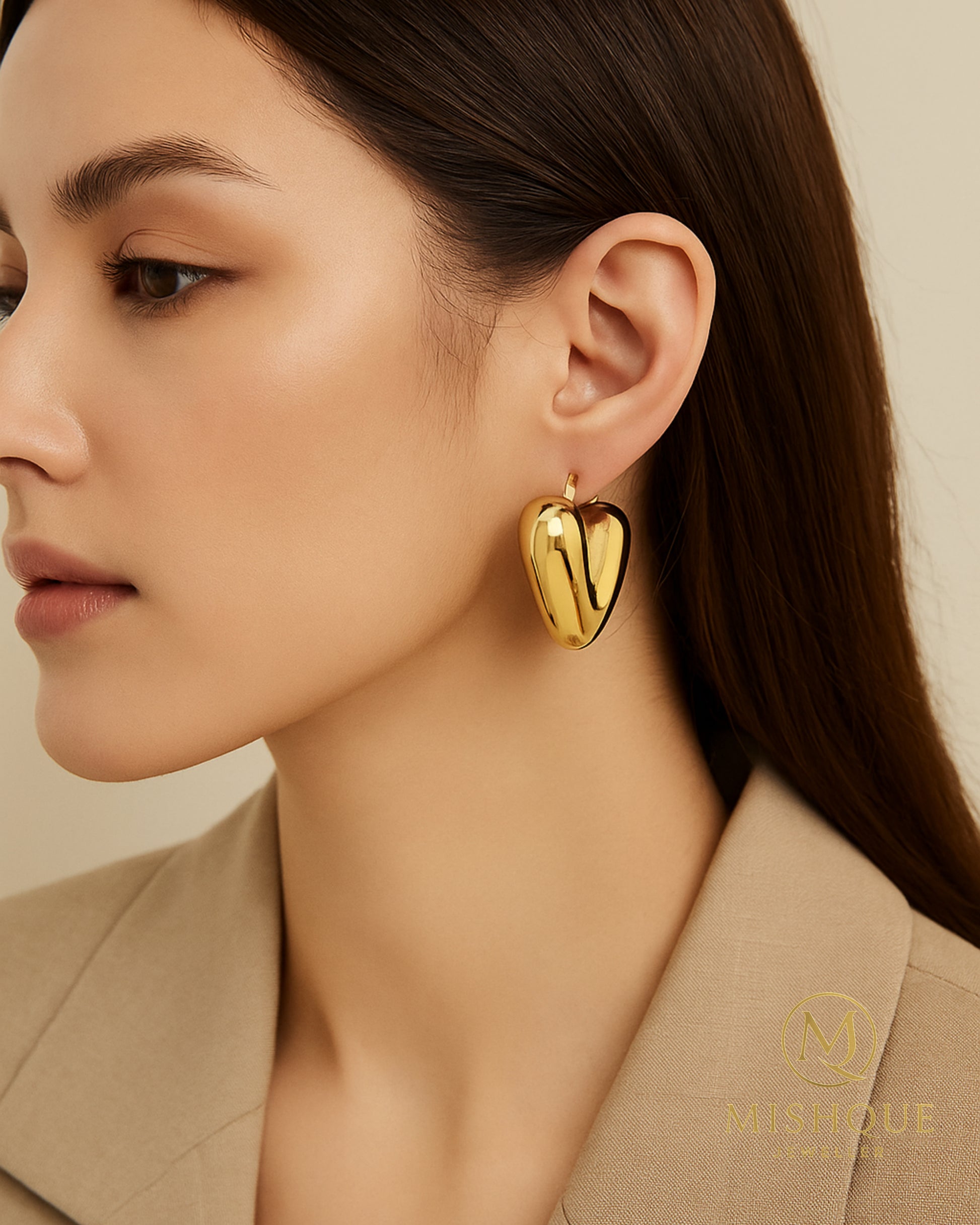 Celebrate love in style with the Golden Heartbeat Hoops by Mishque Jeweller. These bold, heart-shaped earrings are a perfect blend of charm and confidence — crafted to make a statement while staying effortlessly elegant.