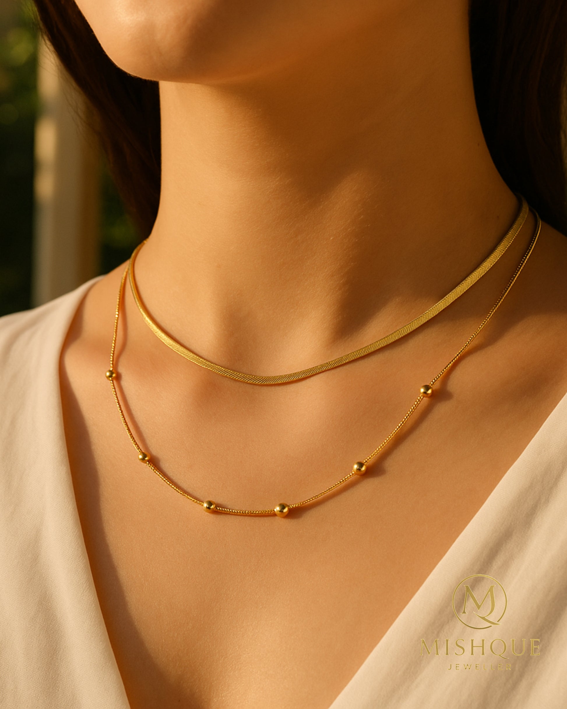 The Soléa Twin Radiance Necklace by Mishque Jewellers embodies grace and modern sophistication. This beautifully crafted two-layer piece features a high-polish flat herringbone chain paired with a delicate beaded cable chain—each layer complementing the other in perfect harmony.